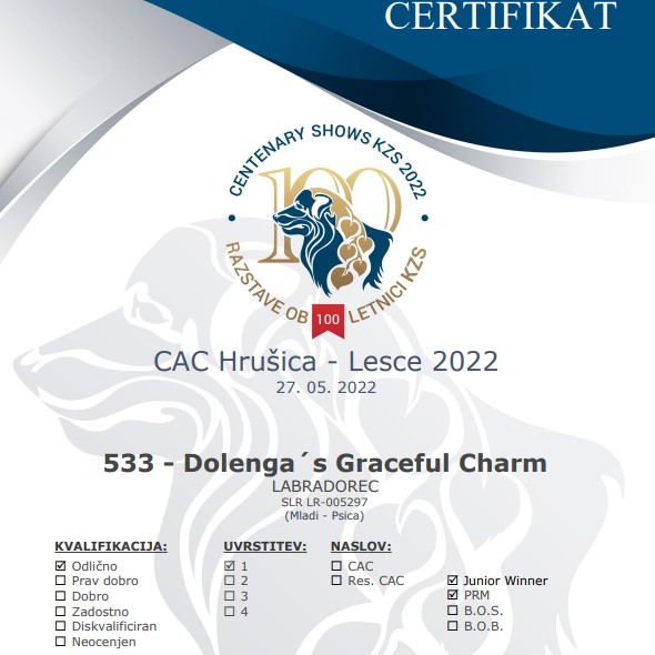 CAC Hrušica- Lesce 27.05.2022, odlično 1, PRM, Junior Winer, sodnik Frank Kane (GB)